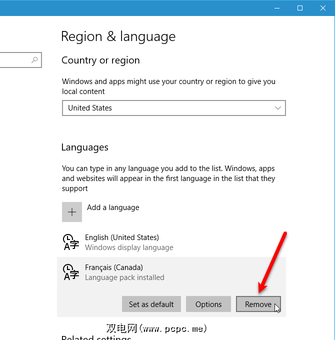一旦您要删除的语言不是默认语言,请在地区和语言屏幕上单击该语言,然后单击删除。