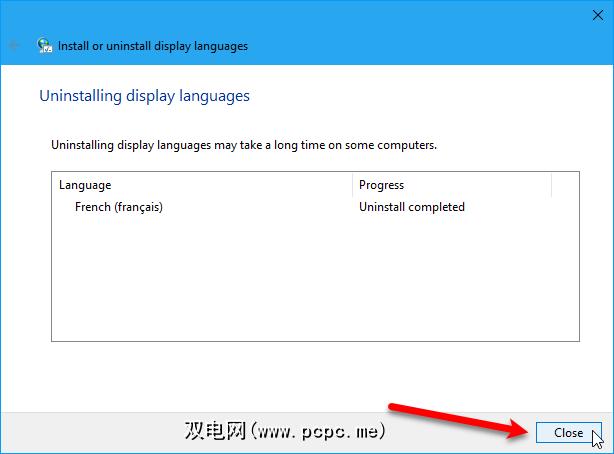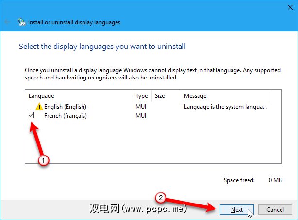 将显示安装或卸载显示语言对话框。选中要卸载语言的复选框,然后单击下一步。