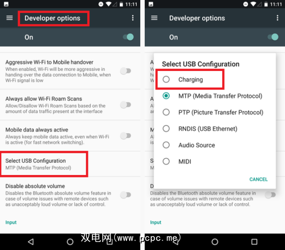 下一步,转到设置>开发人员选项>选择USB配置 >。在选项列表上,确保已选择充电。