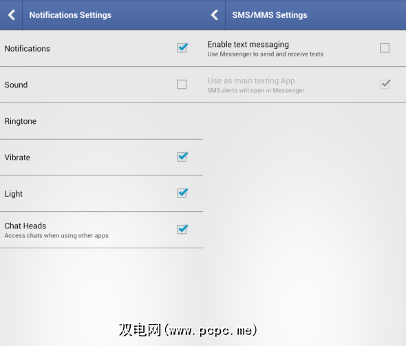 而且,如果您收不到足够的Facebook聊天头样式通知,则还可以为SMS / MMS启用它们。返回设置主菜单,然后打开 SMS / MMS设置。选中启用短信功能,一切都准备就绪。