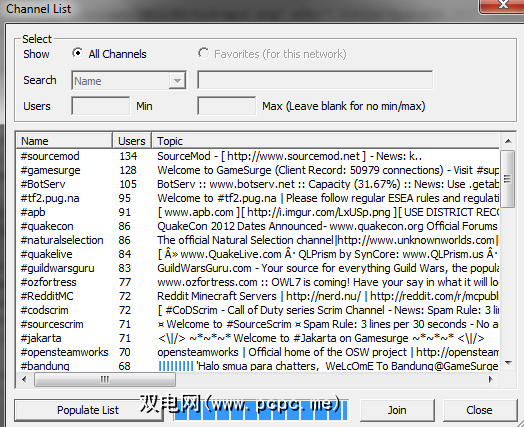 每个服务器都包含许多通道(或房间) )。连接后,将弹出“频道列表"窗口。如果没有,您可以点击进入频道菜单,然后点击频道列表。点击填充列表,然后一秒钟,您将获得服务器上每个频道的列表。单击一次用户标头,您将按照最多用户对频道进行排序。滚动浏览,查看是否有您感兴趣的内容,然后单击加入。