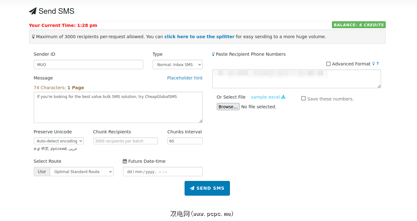 单击菜单中的发送 SMS以编写消息。添加发件人 ID,然后输入或粘贴收件人电话号码。您应该用空格、逗号将它们分开,或者在新行中输入它们。或者,CheapGlobalSMS界面支持导入 CSV、XLS 和 XLSX、VCF 和 TXT 文件。