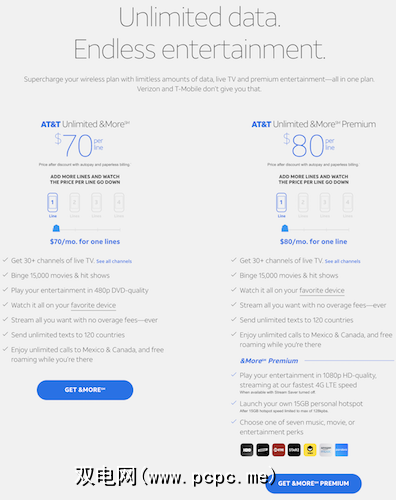 AT&T提供了两种无限计划:AT&T Unlimited&More和AT&T Unlimited&More Premium。