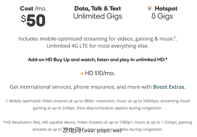 Boost提供了三层无限计划,其中最便宜的是480p流和8GB热点。撞到最昂贵的层之一可以分别获得1080p流和20GB或40GB的热点。