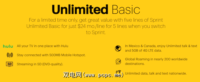 Sprint Basic附带的特权包括Hulu访问,无限制通话,文本以及在墨西哥和加拿大的5GB 4G LTE,在200个国家/地区漫游,480p流质量和500MB热点。