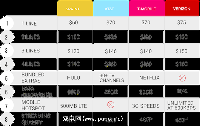 纯粹是看每个运营商提供的最便宜的选择,几个获奖者。 T-Mobile 和 Sprint 均可提供最高的数据量(每个50GB),而每月的费用却最低。