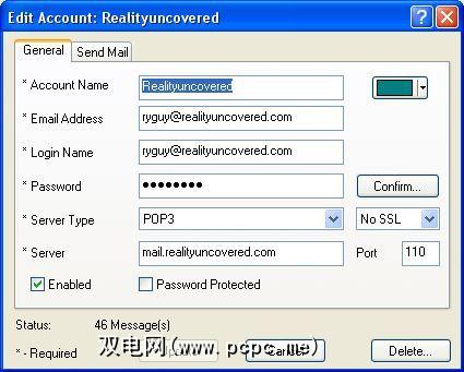 在POP Peeper上设置POP3电子邮件帐户只是一个填写问题两个小屏幕有价值的信息,您已完成。您只需插入传入和传出邮件服务器的基本信息,如下所示,我已在其中设置了RealityUncovered电子邮件的POP3帐户。