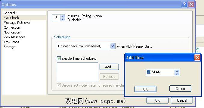 下一步,设置您希望申请去调查您所有的电子邮件帐户。另一个选项是您可以“启用时间安排",这意味着您可以将应用程序设置为仅在一天中的特定时间外出并轮询帐户。仅在午餐时间检查您的电子邮件?将POP Peeper设置为外出并在那段时间内删除所有电子邮件。