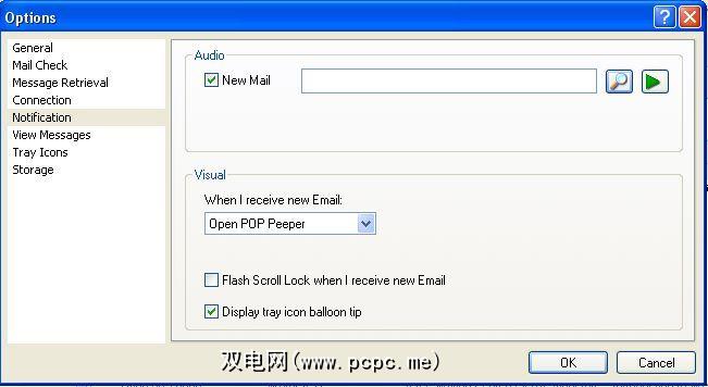 My favorite feature of POP Peeper is the ability to configure how it notifies you when you have new emails. You can have it play a sound file, flash the Scroll Lock light, pop up a balloon from the tray icon and open up the application automatically. You set the level of notification you want that you won’t find too annoying while you’re trying to work.