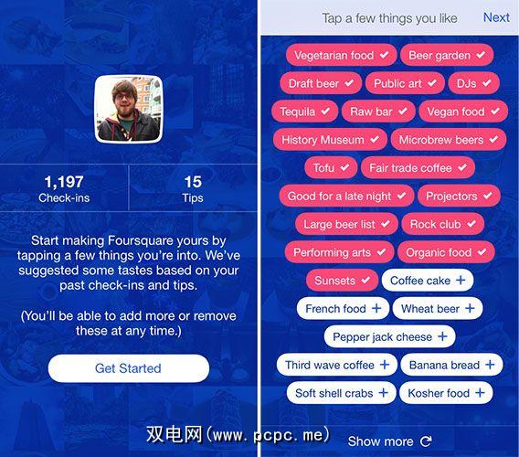 Foursquare的新方法涉及您的口味。首次启动该应用程序(或更新为新版本)时,系统会邀请您选择一些广泛的类别,以便该应用程序可以更好地找到与您的兴趣相关的事物。这些构成了您与服务交互的重要组成部分,您随时可以点击角落的新“ pointy F" Foursquare徽标来提供更多个人偏好,从而进一步改善您的搜索结果。