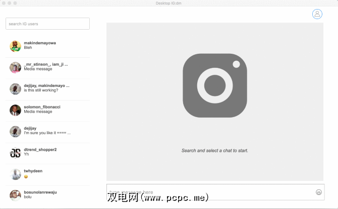 左侧窗格允许您查看最近的20个对话。单击一个以查看右侧的历史记录,然后使用底部的消息框进行聊天。在顶部栏中,您可以搜索其他用户。您还可以单击个人资料图标以使用更多功能,例如自定义通知并查看未关注您的用户。