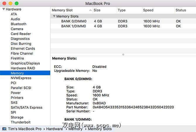 单击系统报告并导航到内存部分以查找更多信息。在这里,您可以查看已安装的RAM数量,这是要升级的另一个重要信息。 macOS还将为您提供内存当前状态的状态报告(尽管您需要进一步测试以查出问题)。