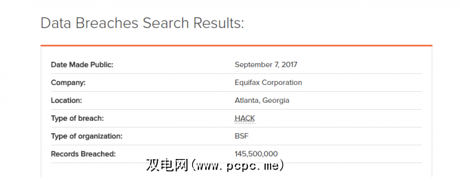 该网站将无法告诉您您的特定数据是否受到破坏。但是,通过确定是否违反了某个机构,您可以了解是否应更改登录详细信息。例如,搜索Equifax将显示有关臭名昭著的Equifax数据泄露的详细信息。