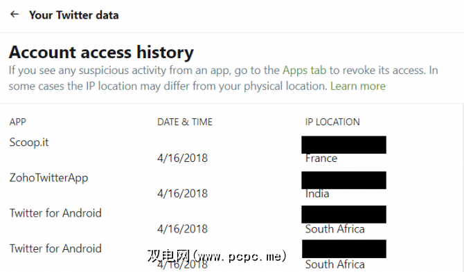 要执行此操作,只需在Twitter设置中打开“您的Twitter数据"菜单。在这里,您可以找到您帐户的登录历史记录。此历史记录包括访问帐户的位置以及访问帐户的应用的列表。