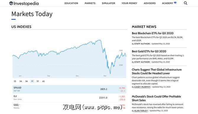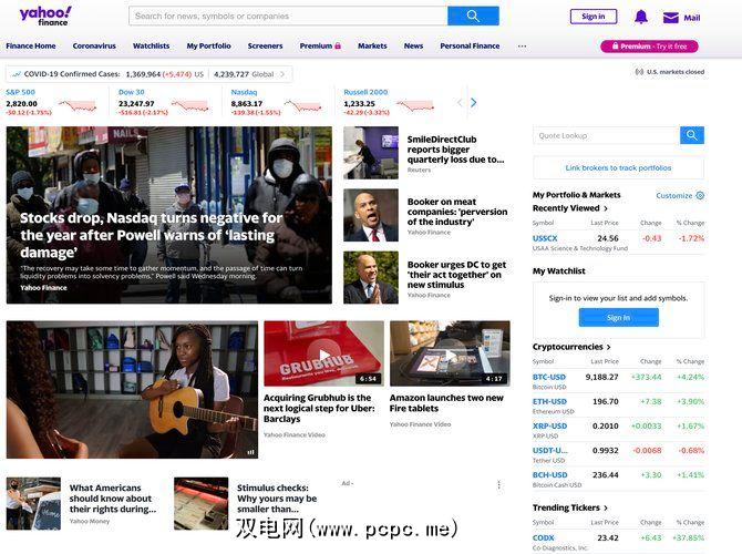 Yahoo!财经在头版发布了大量新闻,以及股价。在首页上,您会找到带有今日指数价格,加密货币汇率和趋势股票的股票行情。