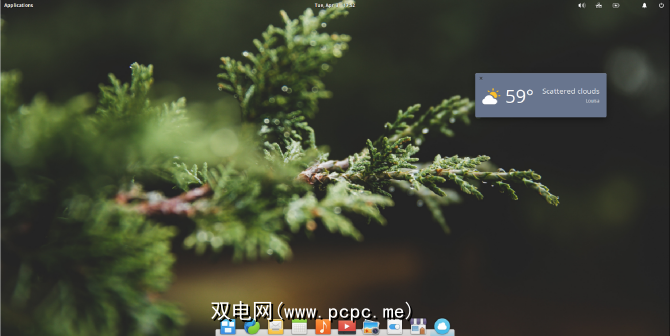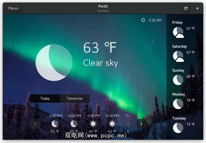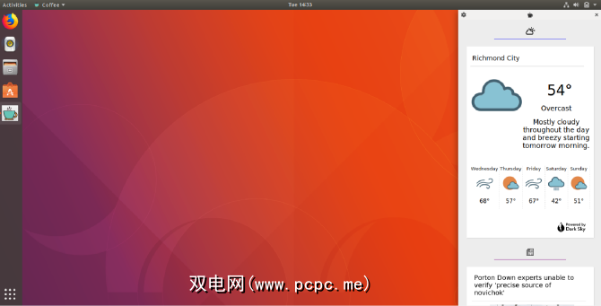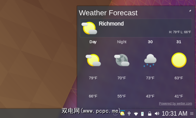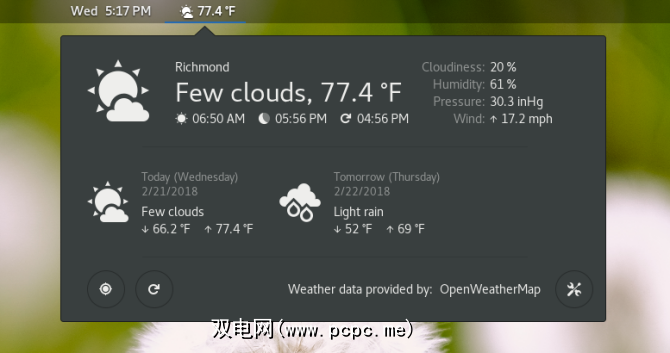 天气是一个小程序,位于面板中系统指示器旁边。图标和文字为您提供当前的天气和温度。单击小程序将显示更多信息。您最多可以看到一周的高点和低点。右列还显示了当前的温度,湿度,压力,风速和阵风。