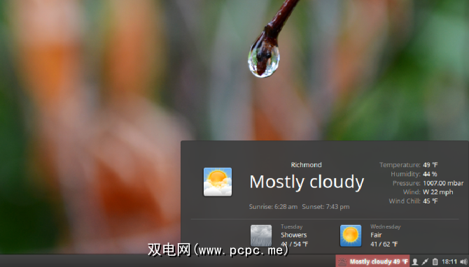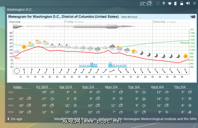KDE的天气小部件将让您知道当天的最高和最低温度。系统任务栏中的图标还将显示天空是否晴朗或是否有降雨。另外,您还可以看到外面的压力和知名度。