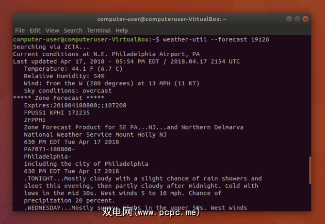 如果您居住在美国,则过程很简单。键入以下命令以获取天气预报:
