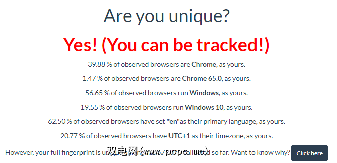 “我是独特的"会记录您系统的指纹并将其添加到自己的数据库中,并在此过程中向您的系统添加四个月的cookie。然后,您可以在几周内回到该网站,检查浏览器指纹的更改以及您是否变得独特。