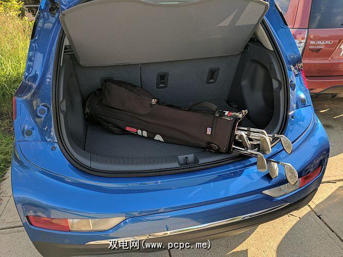 第一天,我驾驶Bolt EV上班,我知道我有下班后和他们见面打高尔夫球。因此,我去将高尔夫球杆装到后备箱中,发现我对电动汽车载货空间的假设仍然是正确的。