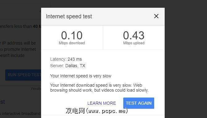 速度测试结果返回为0.10 Mbps下载和0.43 Mbps上传。