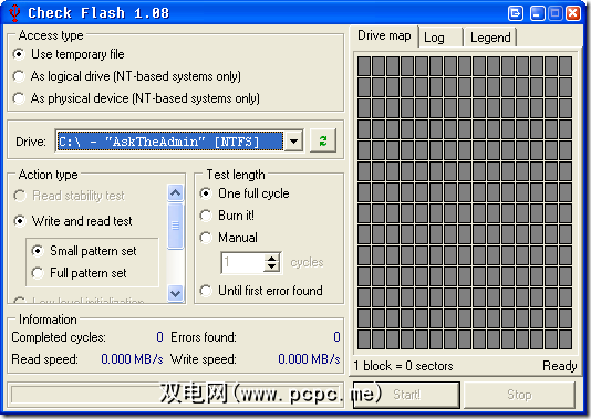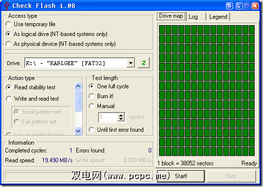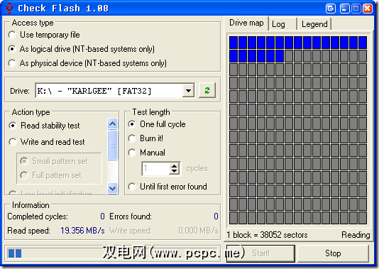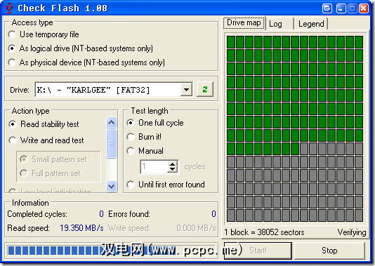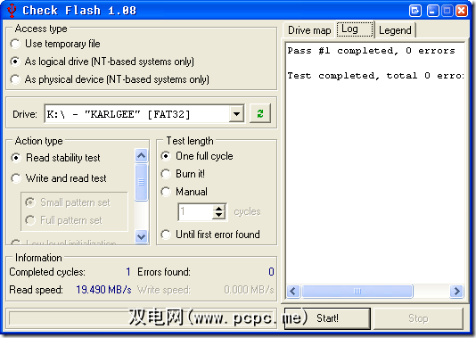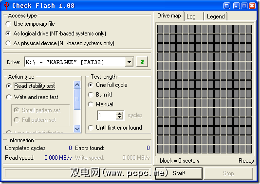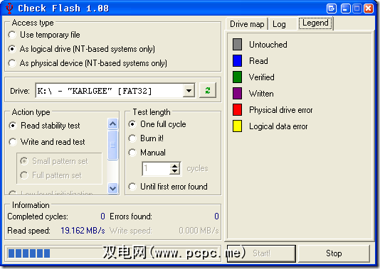 我选择第二个选项用作逻辑驱动器,然后选择K:\我的2GB Cruzer。 除非您要散失驱动器上的所有数据,否则应仅使用读取稳定性测试。重新写入并读取测试将擦除驱动器!您将需要对其进行格式化才能再次使用!注意!