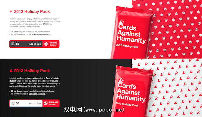 核心Cards Against Humanity游戏的价格为25美元,此外还提供扩展包。您可以购买三个独立的假日礼包,这些假日礼包从2012年到2014年有效,每个礼包可为您带来30张以节日为主题的贺卡。另外,该公司将从他们的所有利润中捐赠给慈善机构。
