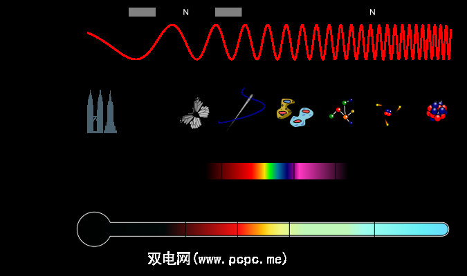 上图说明了频率和波长之间的关系,并说明了其中一些波的大小。例如,无线电波(例如,用于地面FM广播的无线电波)在峰之间可能长达10英尺。高能射线小于原子的宽度(像X射线一样,这是它们有能力穿过您并在胶片上标记图像的功能。