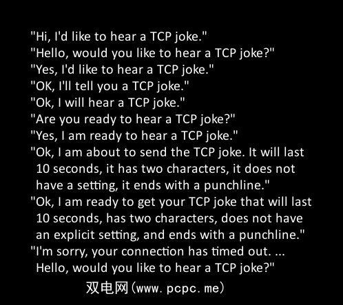 这个概念的最好例证是程序员的幽默,如上图所示。在传输的另一端,接收器将数据包重新组合回原始内容。如果未收到该确认,它将尝试再次发送。这是我们(作为人类)经历的“尝试-等待-尝试-再次"循环。
