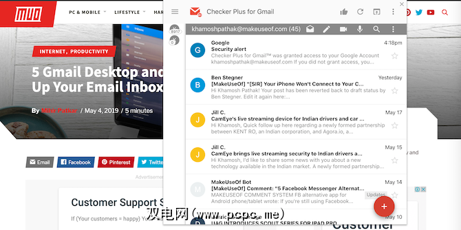 这就是为什么您需要Gmail Checker Plus的原因。该扩展程序是Web上Gmail的增强套件。它创建一个迷你Gmail界面作为浮动菜单。您可以添加多个帐户,在侧边栏之间进行切换,阅读所有电子邮件,存档或移动电子邮件,然后直接从扩展程序中快速回复电子邮件。