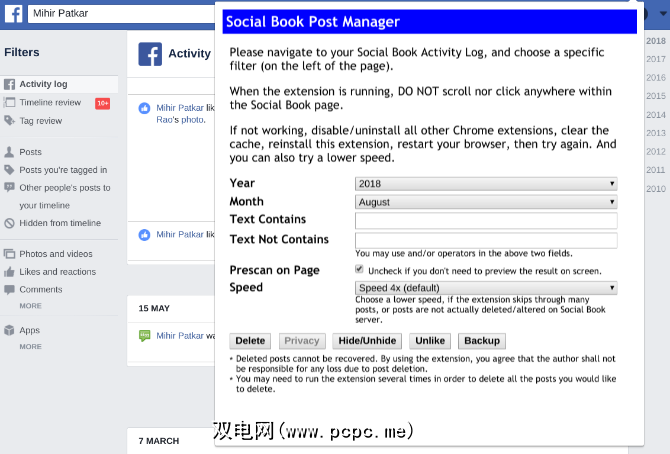 该扩展程序基于过滤器扫描您的帖子历史记录。首先,转到您的活动日志。然后,在扩展程序中,您可以按年份,月份或包含(或不包含)某些单词的帖子进行过滤。让扫描完成,然后从顶部的选项中“全选"并删除。它就像是一种魅力,是批量删除帖子的最简单方法。
