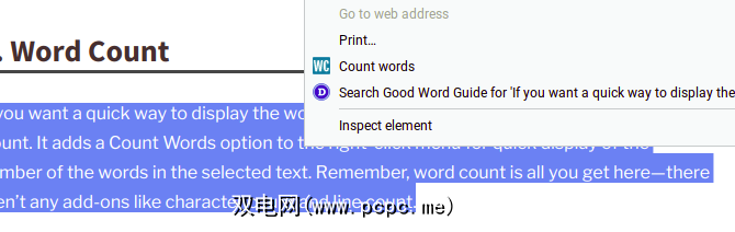 如果您想要一种快速的方法来显示Web上文本片段的字数统计,请安装字数统计。它将计数单词选项添加到右键菜单,以快速显示所选文本中的单词数。请记住,字数统计就是您在这里所获得的—没有字符数和行数之类的任何附加组件。