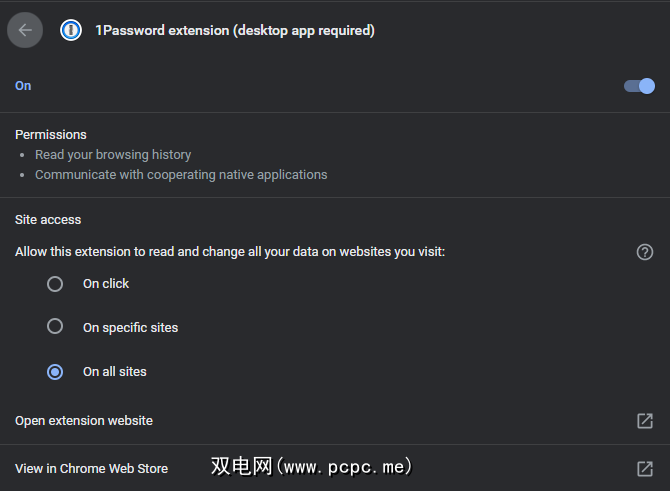 选择详细信息以查看有关扩展名的更多信息,包括其权限。在网站访问权限部分下,您可以选择浏览器可以访问哪些网站的数据。点击打开扩展程序网站也是个好主意-如果它看起来不合法,则表明扩展程序不正确。