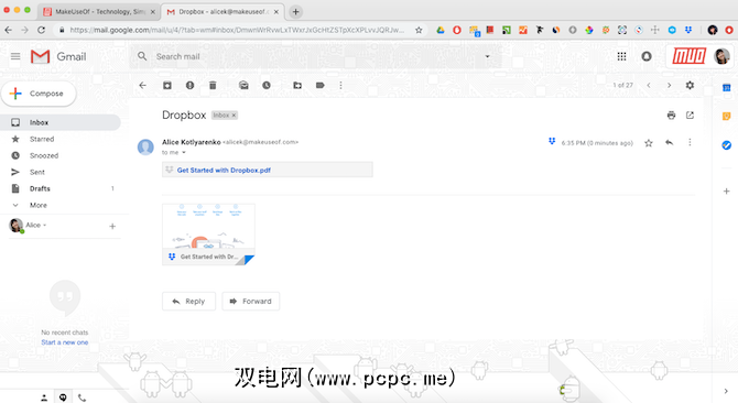 Dropbox for Gmail使该过程更加便捷。当您使用新电子邮件窗口底部的“投递箱"按钮链接到文件时,收件人可以先睹为快。指向图像文件的链接会将图像直接上传到电子邮件,而指向其他类型的文件的链接将生成方便的预览。