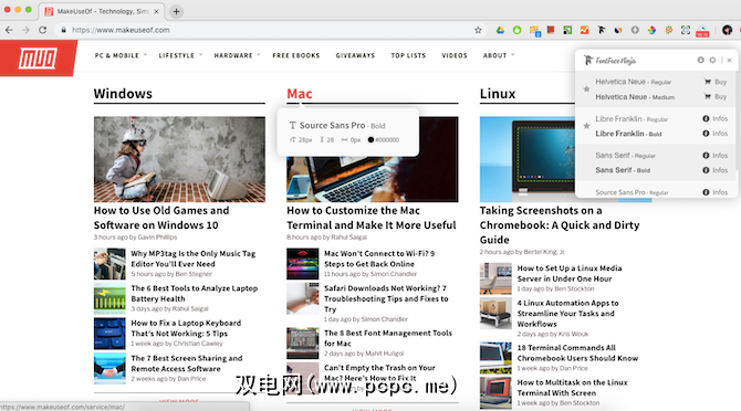 FontFace Ninja是一个Chrome扩展程序,可以帮助您做到这一点。就像从图像中查找字体的工具一样,它可以帮助您识别在线看到的字体。唯一的区别是FontFace Ninja读取编码到页面CSS中的字体,例如标题和正文文本的字体。