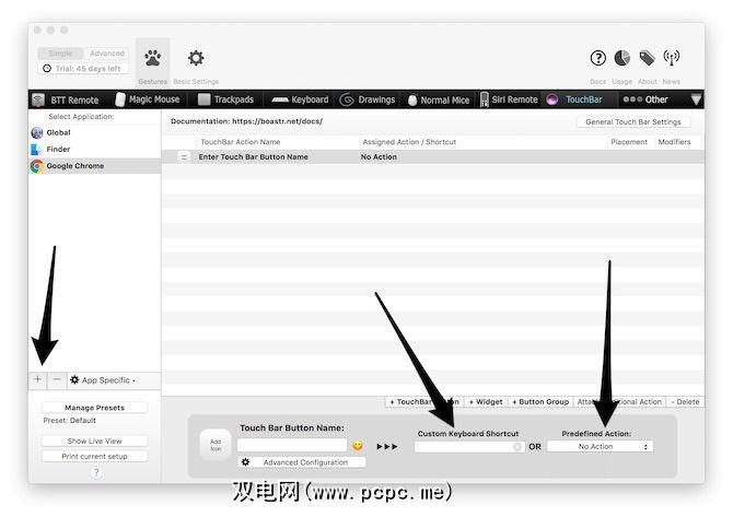 使用BetterTouchTool,您可以为Google Chrome浏览器创建其他按钮。在应用程序的“预定义操作"部分下查找可尝试的内容。 BetterTouchTool不仅可以与触摸栏配合使用。您还可以使用该工具来自定义Magic Mouse,Siri Remote和触控板。