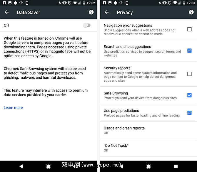 Chrome浏览器中的数据保护程序功能非常酷(见左下图)。这样一来,Google可以先压缩页面,然后再将其发送给您,这可以大大减少您占用的带宽。如果您的数据流量有限,这将非常有用。