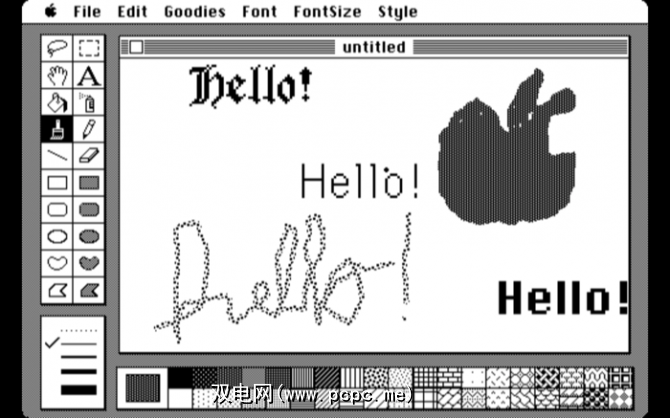 在System 7原始图像中,您可以看到BBEdit的早期版本。在集合中,您可以使用MacDraw在原始Mac演示中的经典“ Hello"上创建riff。简单的黑白图形可以实现的图案数量仍然非常惊人。