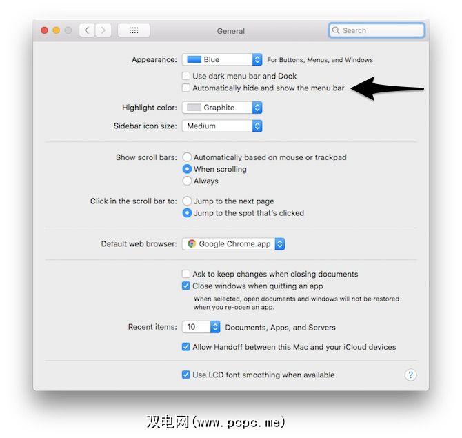 您可以选择隐藏菜单栏,并仅在将鼠标悬停时才显示。为此,请打开系统偏好设置>常规。在这里,选中自动隐藏并显示菜单栏。