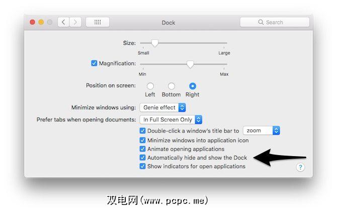 如果您的MacBook屏幕较小,则可以通过隐藏Dock来节省屏幕空间。为此,请打开系统偏好设置>坞站。在这里,选中自动隐藏并显示Dock 。现在,仅当将鼠标悬停在Dock上时,该Dock才可见。