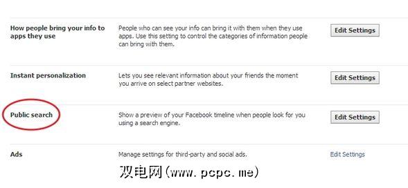 您可以通过打开广告,应用和网站< / em>并向下滚动,直到看到公共搜索。点击编辑设置,然后选中启用公共搜索框。还有一个链接可以查看您的个人资料,并在公共场合显示。