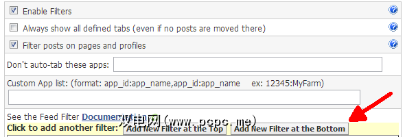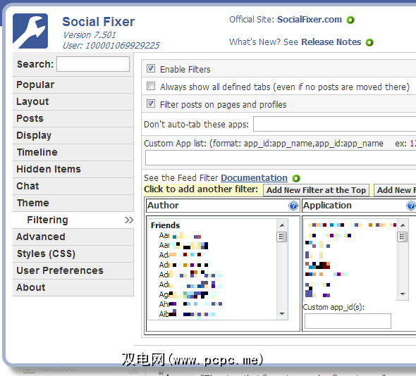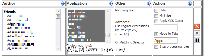 Social Fixer提供了有关其过滤选项的详尽文档。简要地说,您有四个不同的列: Author , Application , Other 和 Action 。您在前两列中选择的内容都将通过 Other 中设置的过滤器进行处理,并提交给选定的 Action 。如果您没有在前两列中进行选择,而是在 Other 中定义了匹配文本,那么将过滤所有作者和所有应用程序以进行匹配文字。