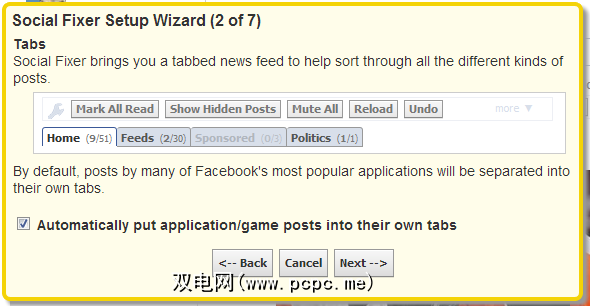 本文将重点介绍为新闻Feed过滤内容,这也是第二步在安装向导中。如果您希望自己可以自动将应用程序和游戏帖子与其他帖子分开,那么您将很高兴看到这是Social Fixer的默认功能之一。但是当然,如果您希望继续看到这些更新,也可以将其关闭。