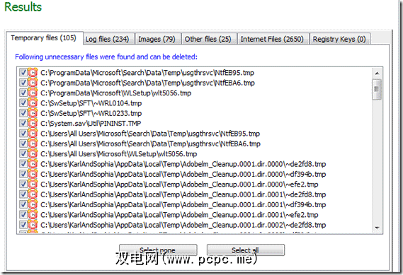 哇,我惊讶又被同一个呼吸所打动。它发现了一些垃圾文件,单击后似乎不需要任何东西。浏览每个选项卡并滚动浏览文件,然后单击确定将其杀死。它们都是默认选中的。您可以在屏幕底部选择全部或不选择按钮。