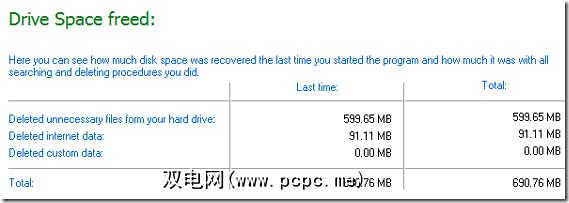 点击是,然后观看因为它删除了它们。它遍历每个部分,例如日志文件,图像等,并删除每个文件。我的互联网文件自行删除将近10分钟。您能想象其中有多少废话吗?完成后,您将再次看到第一个屏幕,其中包含您的结果。我摆脱掉了高达636 MB的空间!