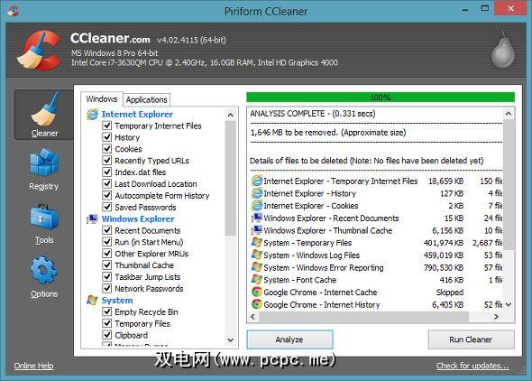 接口: CCleaner是最清洁的工具之一。推荐给任何人使用的系统清洁剂-它包含一个非常干净,理智的界面。它的所有导航按钮都可以在窗口的左侧找到,该按钮列出了应用程序的不同功能。如果一个功能具有更多子功能,这些功能也会在左侧列出。我还喜欢它以一种格式正确的格式在屏幕顶部显示系统统计信息。但是,有些人可能会认为这有点无聊,但是,嘿,这是系统清理程序吗?