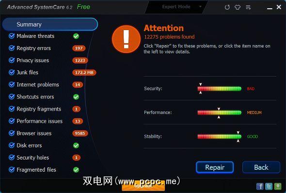 扫描时间和结果:我进入Care并选择了所有可用设置并对其进行了扫描。在检查了12种不同类型的问题之后,它在1分钟8秒内返回了“ 12275问题"。它也使我恢复了安全性,性能和稳定性。显然,我的安全性很差,性能中等,稳定性也很好。