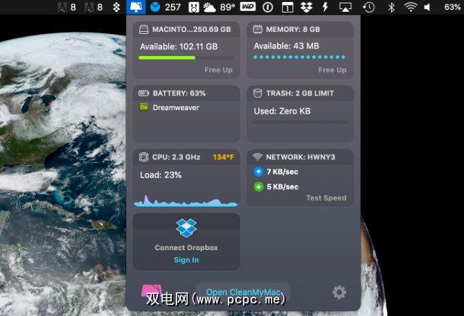 只需单击该图标即可打开状态概览。当您的Mac运行速度比正常运行速度慢时,这是个好地方。只需单击一下,您便可以删除垃圾箱或释放RAM。