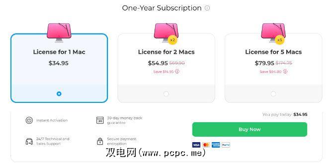 一台Mac的一年订购许可证价格为$ 34.95。同时,两台Mac的许可价格为54.95美元。您可以以$ 79.95的价格订购五台Mac。