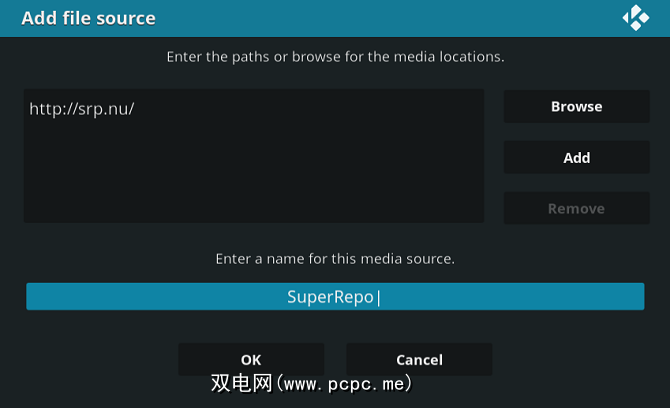 打开Kodi。转到设置>文件管理器>添加源>添加源>无。在屏幕上键入 http://srp.nu/ ,然后单击确定。